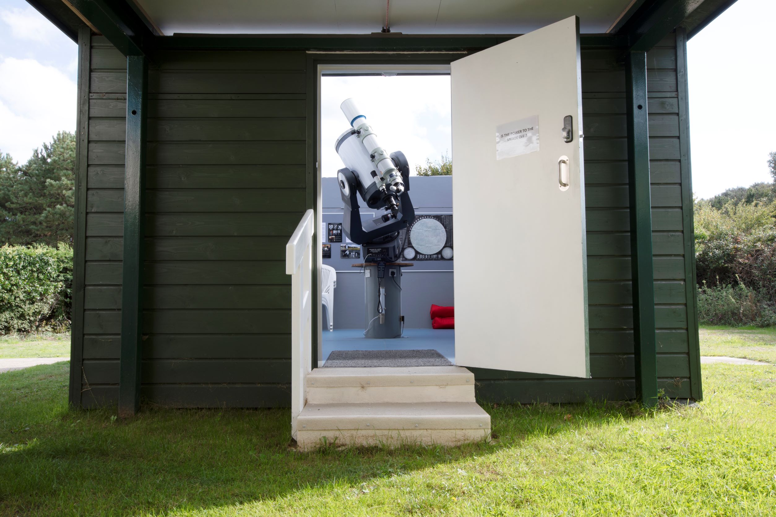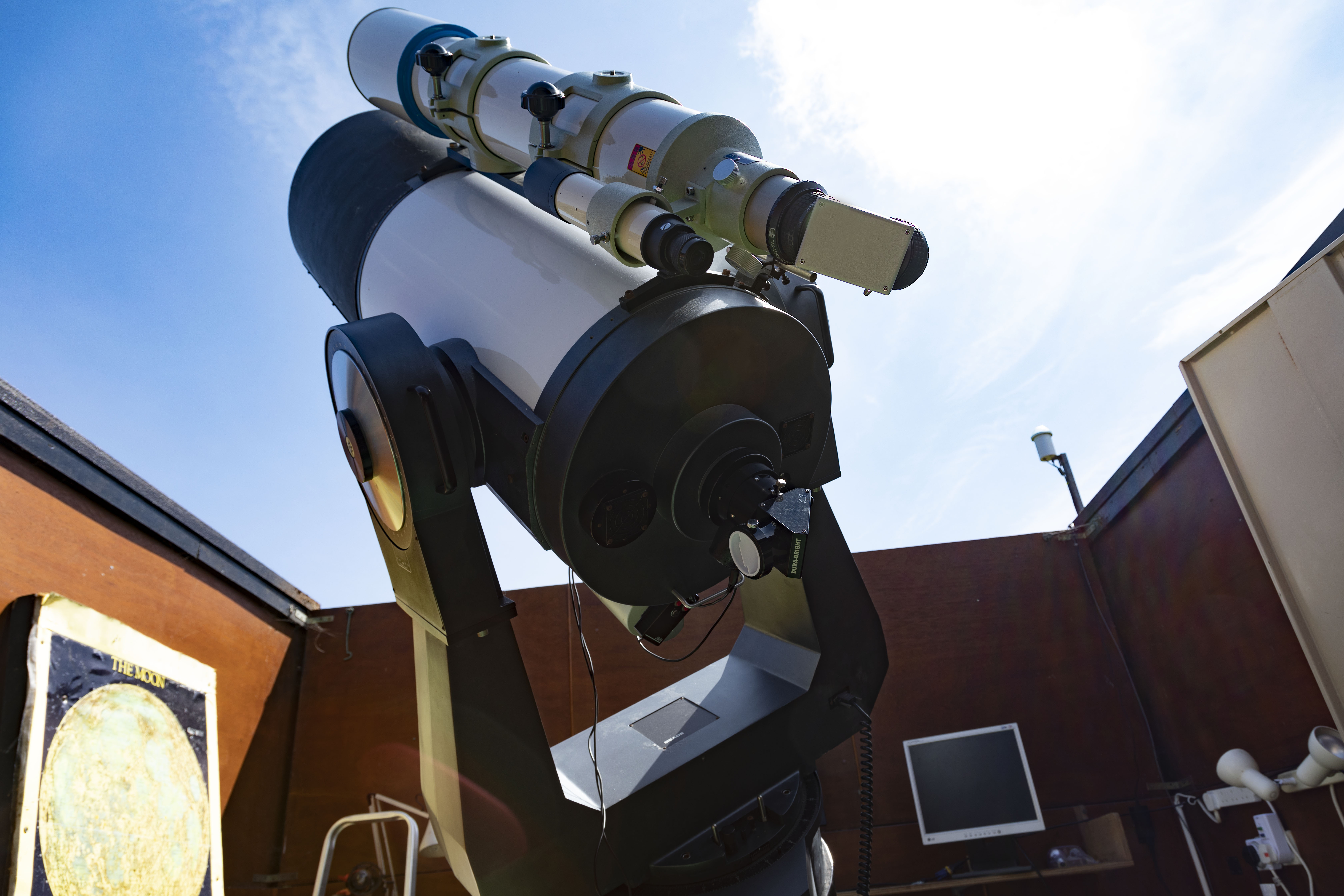 Adjacent to this is a timber-framed roll-off roof building that houses a 16-inch Meade reflecting telescope and 5-inch Takahashi refractor on an LX200 equatorially configured mount which is connected to a computer. There is also a 55” wall mounted monitor that can be used for presentations.