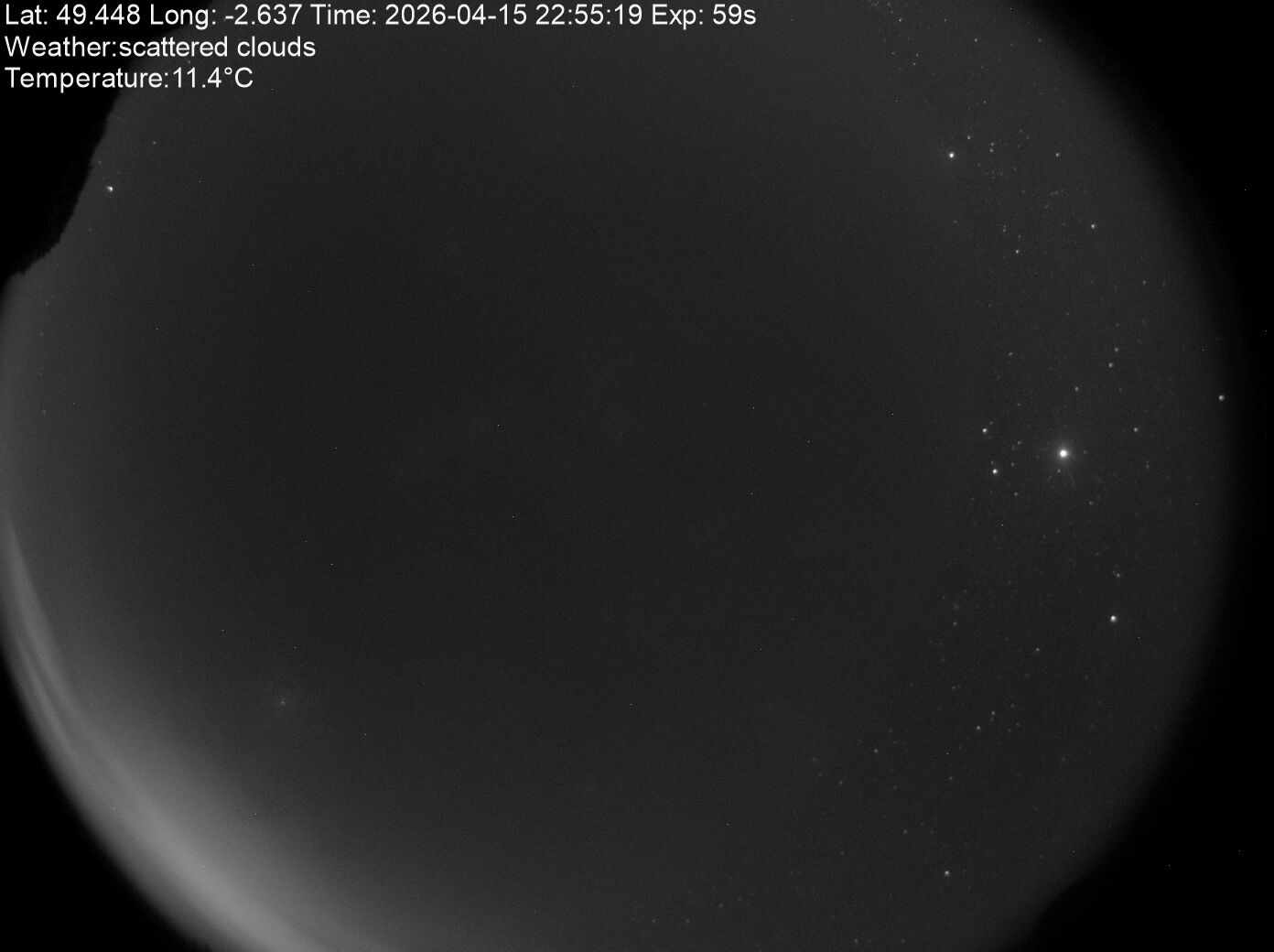 A Starlight Xpress Oculus All-Sky Camera 150º is set up at the observatory. The camera continuously captures images during the night, with each exposure being up to 59 seconds. The latest image is uploaded to this page and, at the end of the night, the images are assembled into a timelapse video allowing the whole night to be reviewed.